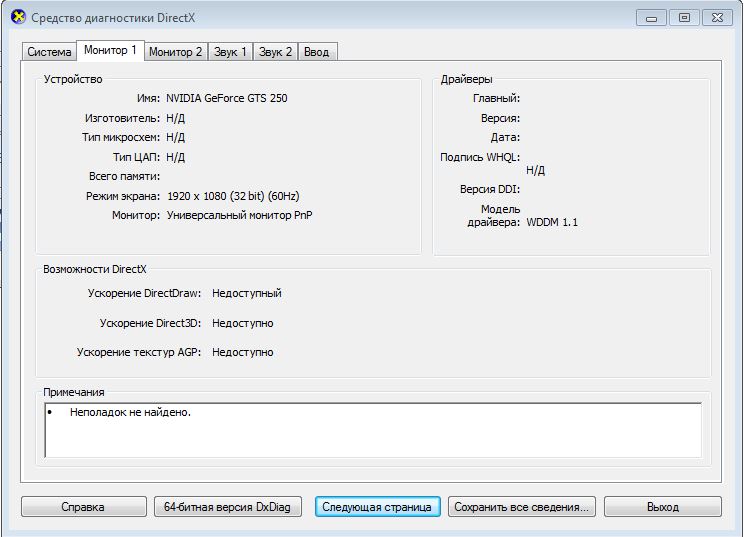 У меня не работает должным образом DirectX. При запуске dxdiag появляется окно (см. dxerror.jpg, не умею изображения вставлять(((), если нажать "Нет", то DxDiag закрывается с ошибкой, если нажать "Да", т.е. обойти использование, то в DxDiag имеем (см. dxdiag1.jpg). Скачивание и запуск DXWebSetup с сайта Microsoft ничего не дает, пишет, что установлена более новая или эквивалентная версия DirectX. Драйвера на видеокарту (NVIDIA GeForce GTS 250) самые новые 327.23. Пробовал удалять их с ставить заново. Direct3D все равно не пашет. Панель управления NVIDIA видит такие сведения о системе(см. NVIDIA Sytem*.txt). В системном реестре в ветке HKEY_LOCAL_MACHINE\SOFTWARE\Microsoft\Direct3D\ есть только каталог DriverCompat, который выглядит так(см. reg.jpg), причем во многих папках параметр D3D10OpenAdapter REG_QWORD имеет значение 0 (0х00000000). В настройках мониторов нельзя изменить параметры(см. disp.jpg), а там помнится был бегунок программное/аппаратное ускорение. Как можно запустить Direct3D или исправить его? Ускорение DirectDraw и ускорение текстур AGP, как видно тоже не работает. Что где посмотреть, где что настроить, поправить кто-нибудь знает? Есть какие-нибудь варианты решения без переустановки системы? |