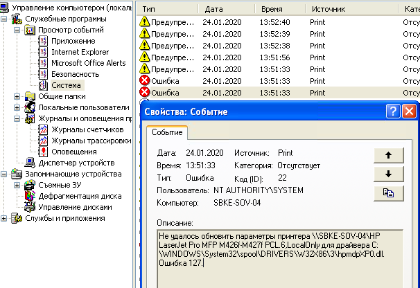 Более того, дальнейшие изыскания показали, что и установка нового принтера больше невозможна (была проведена пробная установка принтера, драйвера которого имеются в дистрибутиве windows на локальный порт lpt1). То есть драйвера копируются, но уже в самом конце опять же выдается ошибка, что завершение операции невозможно. В системном журнале - три последовательных сообщения: 1) драйвера копируются 2) принтер ожидает удаления 3) принтер удален. Скриншоты всех ошибок прилагаются. |