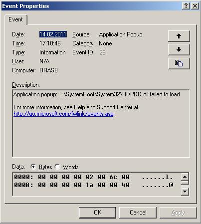My Computer->Properties->Remote Устанавливаем "Enable remote desktop on this computer" Удаленная машина (WinXP) mstsc.exe, вводим название/IP-адрес сервера, нажимаем "подключить" - результата нет. На сервере в журнале событий системы получаем с десяток сообщений : (1.jpg) Мелкософт по этому поводу пишет : The program could not load a driver because the program user doesn't have sufficient privileges to access the driver or because the drive is missing or corrupt. Все действия производятся с правами администратора домена, прав по идее должно хватать. На других серверах описаных действий было достаточно. Подскажите, где смотреть? |
