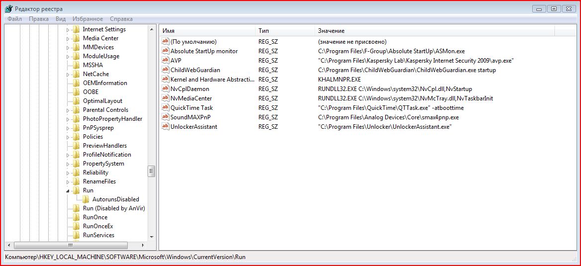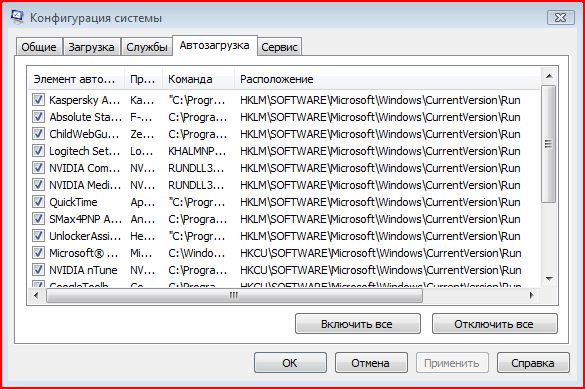 Список автозагрузки? вот Kaspersky Anti-Virus Absolute Startup Monitor ChildWebGuarduan Logitech SetPoint NVIDIA Compatible Windows... NVIDIA Media Center Library QuickTime SMax4PNP Application RealPlayer (32-bit) unlocker Assistant Absolute Startup Monitor Microsoft (R) Windows (R) Operating System NVIDIA nTune GoogleToolbarNotifier WMPNSCFG Adobe Acrobat Adobe Reader Synchronizer Severny, да точно я ошибся когда писал. |
