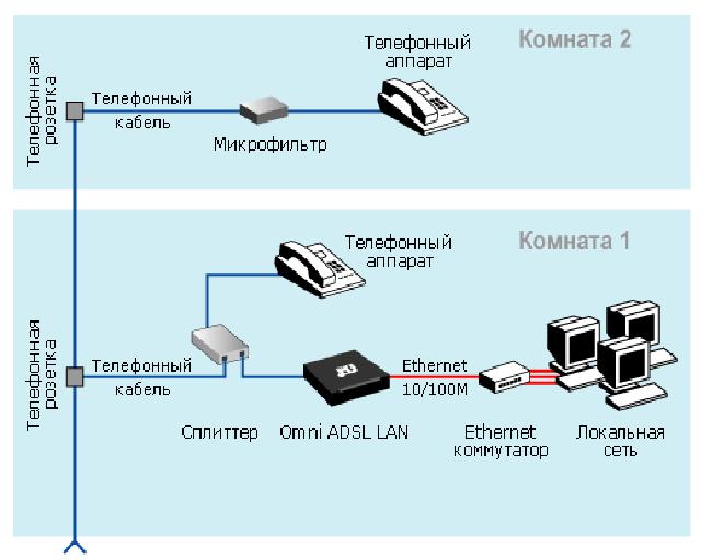 Сплитер (делитель) — устройство, предназначенное для разделения сигнала в телефонной линии на две составляющие: обычный телефонный сигнал и высокочастотный модемный сигнал. Сплитер защищает телефонные аппараты от высокочастотных модемных сигналов, передающихся по телефонной линии при использовании ADSL-технологии. В зависимости от схемы подключения вам могут понадобиться дополнительные микрофильтры. Микрофильтр — устройство, устанавливаемое перед телефонным аппаратом для защиты его от высокочастотных сигналов модема. Если в квартире есть телефонные аппараты, подключенные минуя сплитер, их необходимо подключить через микрофильтры, установив микрофильтр в разрыв между телефоном и телефонной розеткой. Смотри картинку во вложении. |