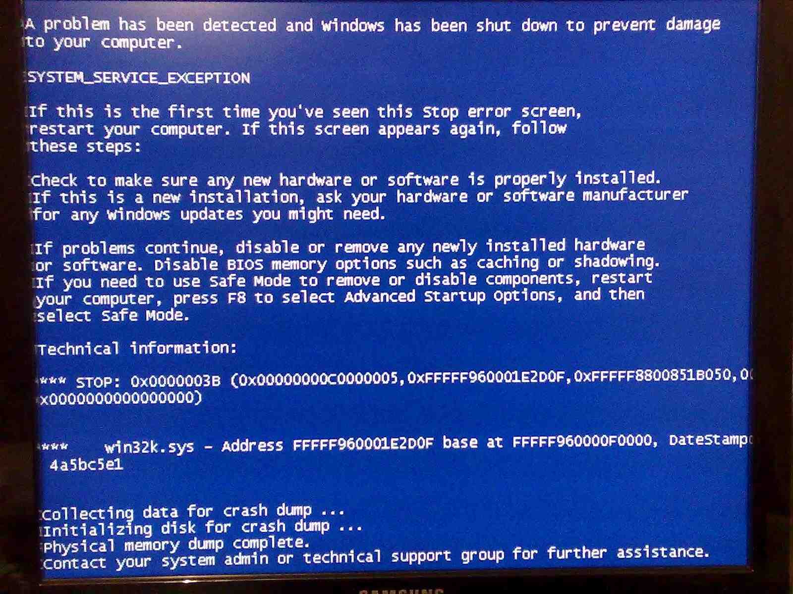 Компьютер был перезагружен после критической ошибки. Код ошибки: 0x0000003b (0x00000000c0000005, 0xfffff96000172d0f, 0xfffff88006d1a050, 0x0000000000000000). Дамп памяти сохранен в: C:\Windows\Minidump\090809-24328-01.dmp. Код отчета: 090809-24328-01.