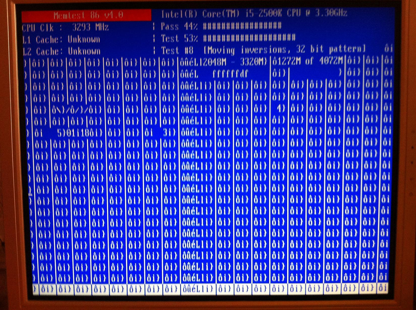 Пробовал тестировать оперативку memtest-ом и где то на 7 проходе или иногда 2 появляются непонятные кракозябры (фото во вложенном файле foto.JPG)