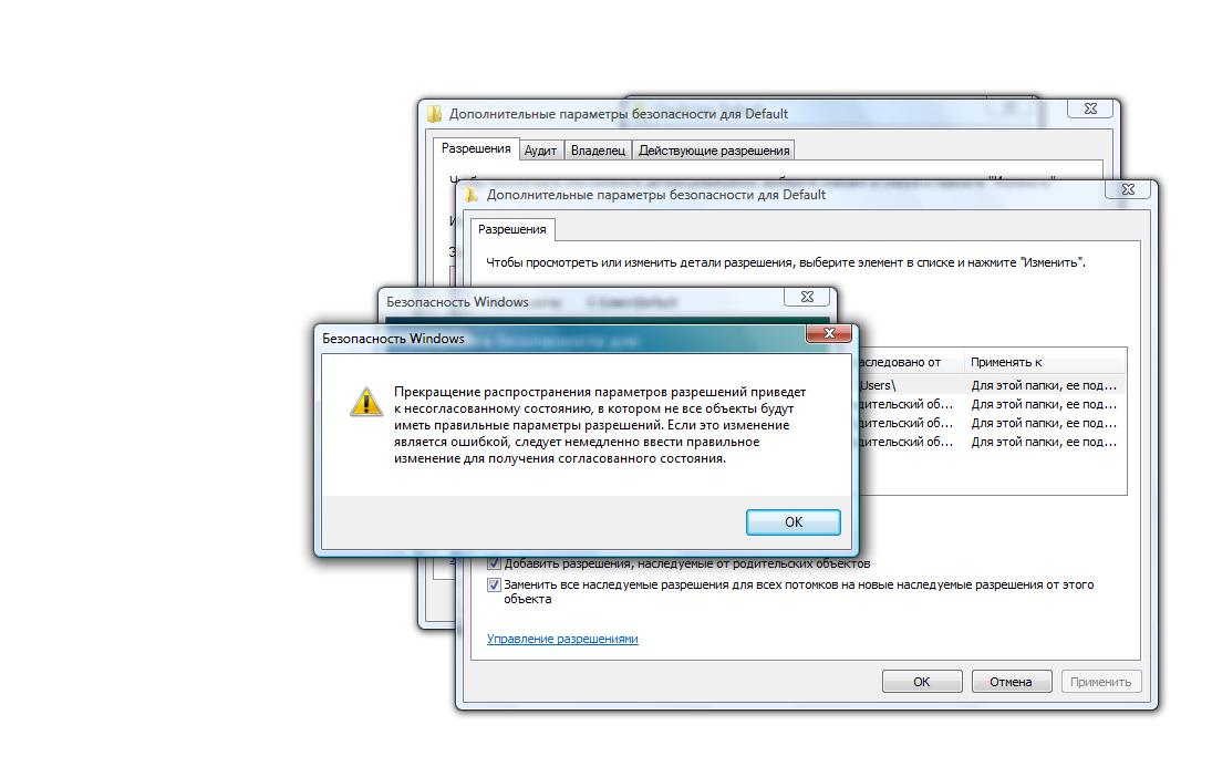 Профиль | Отправить PM | Цитировать Зашла как вы сказали в С:\USERS\DEFAULT - СВОЙСТВА -БЕЗОПАСТНОСТЬ - ДОПОЛНИТЕЛЬНО - И НАЖАЛА "ЗАМЕНИТЬ ВСЕ НАСЛЕДУЕМЫЕ РАЗРЕШЕНИЯ ДЛЯ ВСЕХ ПОТОМКОВ НА НОВЫЕ НАСЛЕДУЕМЫЕ РАЗРЕШЕНИЯ ОТ ЭТОГО ОБЪЕКТА"