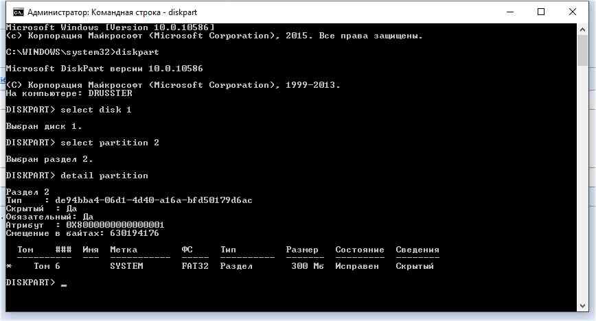 drusster@vk, не выходя из diskpart после выбора select disk 1 и select partition 2, там же: