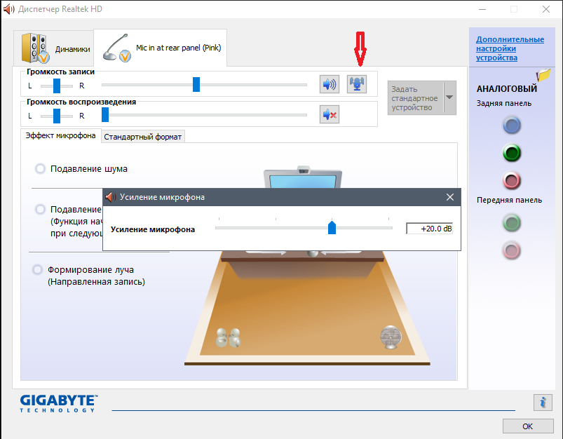 http://www.realtek.com.tw/ Quick Links --> HD Audio Codec Driver Скрины ниже: 1) после подключения микрофона (гарнитуры) 2) усиление микрофона Честно говоря, не видел ни одного нормально работающего микрофона на гарнитурах |