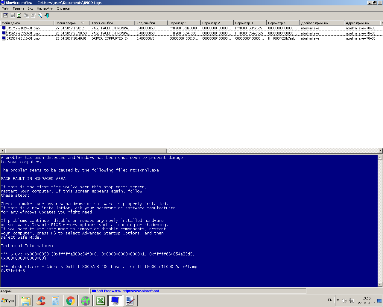 Имеется x64 система с Windows 7 на ней, крайне аккуратно и бережная на ней же автозагрузка (за ней и прочим софтом я очень пристально слежу, не допуская появления всякого ненужного), несколько игр и всякого разного. Самой системе около года (может больше чутка). Сколько я на этом компьютере не работал - НИКОГДА не видел Синих Экранов, а тут 3 раза за 2 дня выпал. Причем - не по самой ясной причине. В первый раз я запустил комп, поиграл немного, затем открыл Хром, врубил видео, а на фоне конвертировались видео для телефона, сам я отошел. Вернувшись и усевшись, спустя пару минут вылез Синий Экран (в дальнейшем просто "СЭ"). Не особо успел заметить код ошибки, но было что-то про .sys какой-то файл. Я давай сразу sfc /scannow запускать - ничего не нашел. Причем, шо странно - в последующий СЭ я не видел ничего про .sys. Показаться могло, но вряд ли, я четко помню, вроде. Диск на ошибки поставил проверяться - ничего. Ладно, думаю, бывает. С температурами железа все окей, как и со всем остальным. Вчера, даже ведь не сразу, а через часа 3-4, после игр, фильма, серфинга, верстки книги в InDesign - он снова выдал синьку и ушел в перезагрузку. С использованием памяти, нагрузкой на цп - все было ок. 3-й раз он выдал синьку тоже через пару часов после всяких разных действий. Скачав после 3-го СЭ bluescreenview я заметил, что между 1-м и 2-3-ми СЭ-шками есть разница: 1-й код (0x000000c5) ругался на "DRIVER_CORRUPTED_EXPOOL", а 2-й и 3-й код (0x00000050) ругались на "PAGE_FAULT_IN_NONPAGED_AREA", причем все 3 ошибки ссылаются на файл "ntoskrnl.exe". Я, конечно, немного почитал всякого разного и вечером буду проверять оперативку с жестким диском, а затем попробую с установочной флешки этот самый файл восстановить, но... Если кто-то сталкивался с чем-то подобным и знает, как эту нечисть обратить себе во благо - буду крайне благодарен! |