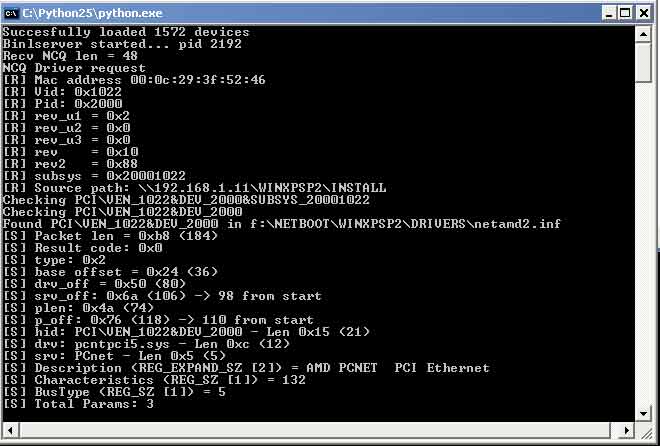 Распаковываю ris-linux в каталог E:\NETBOOT\RIS-LINUX. Теперь необходимо сформировать базу ответов. Для этого выполняю команду: infparser.py E:\NETBOOT\WINXPSP2\DRIVERS. Теперь запускаю BINL, с помощью программы binlsrv.py.