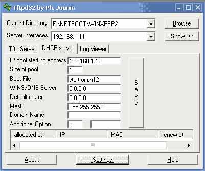 Имя загружаемого файла. В каталоге E:\NETBOOT\WINXPSP2 находится два файла загрузчика startrom.com и startrom.n12. Первый файл (startrom.com) для начало процесса инсталляции потребует нажатия F12, второй файл (startrom.n12) не требует. Я выбрал файл startrom.n12