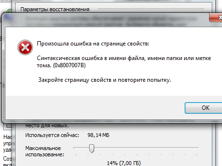 Профиль | Отправить PM | Цитировать Здравствуйте! По какой-то причине было отключено восстановление системы. Включил, но не могу задать процент использования дискового пространства, теперь они минимальный - 1% (512,1 МБ), если его увеличивать, то возникает сообщение об ошибке (см. вложение). Пробовал команду chkdsk /f, не помогло, не знаю что ещё можно сделать? ОС Windows 7 x64.