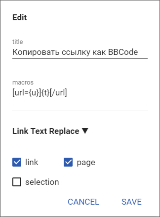 Для аналогичного копирования ссылки на страницу на которой находимся можно добавить пункт контекстного меню страницы. для этого представленный ниже код необходимо поместить в секции [Document Popup Menu] Item, "Ссылка на страницу в BBcode"=External action,,,, "Copy" | Go to page, "javascript:(function(){var t=document.createElement('textarea');t.style='position:fixed;left:0;top:0;';t.value='[url='+location.href+']'+document.title+'[/url]';document.documentElement.appendChild(t);t.focus();t.setSelectionRange(0, t.value.length);setTimeout(function(){document.documentElement.removeChild(t)},200)})()" & Delay, 100 & Copy