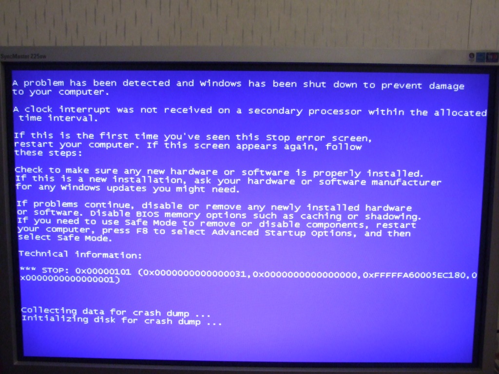 Профиль | Отправить PM | Цитировать Здравствуйте, прошу прощения если не в тот топик пишу, дело вот в чем: постоянно вылетает BSOD 0x00000101, как я понял что-то насчет того, что второе ядро перестало отвечать. Привязки возникновения ошибки к каким нибудь действиям не наблюдается, она может появиться где угодна и когда угодно, но вероятность повышаетси при играх или работе с емкими приложениями. Сижу на Висте (ХР не предлогать). С покупки компа долгое время работал на ХР, которая работала безукаризненно разве что я не сопутствовал ее угробить, но даже с "голой" Вистой BSOD дает о себе знать. Комп разогнан и первоначальная конфигурация изменена. Но даже в первозданной конфигурации, после перехода с ХР, глюк был в той же форме что и сейчас. Насчет разгона могу сказать что он даже улучшает работу системы. С настройками по умолчанию ошибка не дает о себе забыть намного чаще (примерно 10 раз при просмотре полуторочасового FullHd фильма на играх дело ище хуже) чем с разгоном (запросто можно посмотреть в свое удовольствие фильм или с час наслаждатся игрой, хотя случаются казусы когда за полчаса игры приходилось видеть "синиву" два раза при условии что комп с полным запуском всех прог грузится 5 минут, а в простое так вообще способен работать неделями). Поиски в нете не дали исчерпывающих ответов...