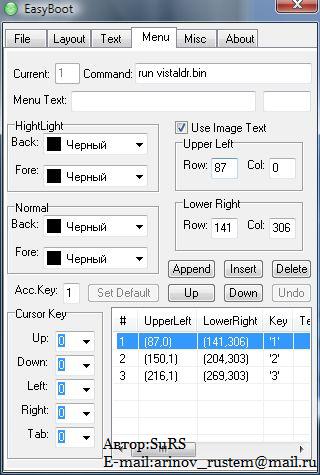 Действие №1: Какие должны-быть папки и файлы! disk1\ \BOOT \EFI \ezboot \I386 \SOURCES \SUPPORT \UPGRADE ...AUTORUN.INF ...SETUP.EXE от VISTЫ или от XP ...BOOTMGR ...BOOTFONT.BIN ...WIN51 ...WIN51IP ...WIN51IP.SP2 ------------------------------------------------------------ Действие №2: В папке ezboot должны лежать только такие файлы! ezboot\ ...BACK.B15 ...w2ksect.bin ...w2ksect.ini ...LOGO.B15 ...LOGO.BM2 ...vistaldr.bin ...vistaldr.ini ...BACK.BM2 ...standard.ctb ...loader.bin ...cdmenu ...BACK.bmp ...LOGO.bmp --------------------------------------------------------------------------------------- Действие №3: Какие вписиваем параметры в файлы w2ksect.ini и vistaldr.ini! w2ksect.ini: \i386\setupldr.bin ; Установка Microsoft Windows XP ; Установка Windows XP vistaldr.ini: \boot\bootfix.bin ; Установка Vista ; Установка Windows Vista --------------------------------------------------------------------------------------- Действие последнее: настраевем команды в EasyBoot! Установка Windows Vista: вписываем: run vistaldr.bin Установка Windows XP: вписываем: run w2ksect.bin --------------------------------------------------- Ну и все! А кто не понял как! скачайте rar_файл ezboot с файлами! ----------------------------------------------------------------- Автор: SuRS --------------- |