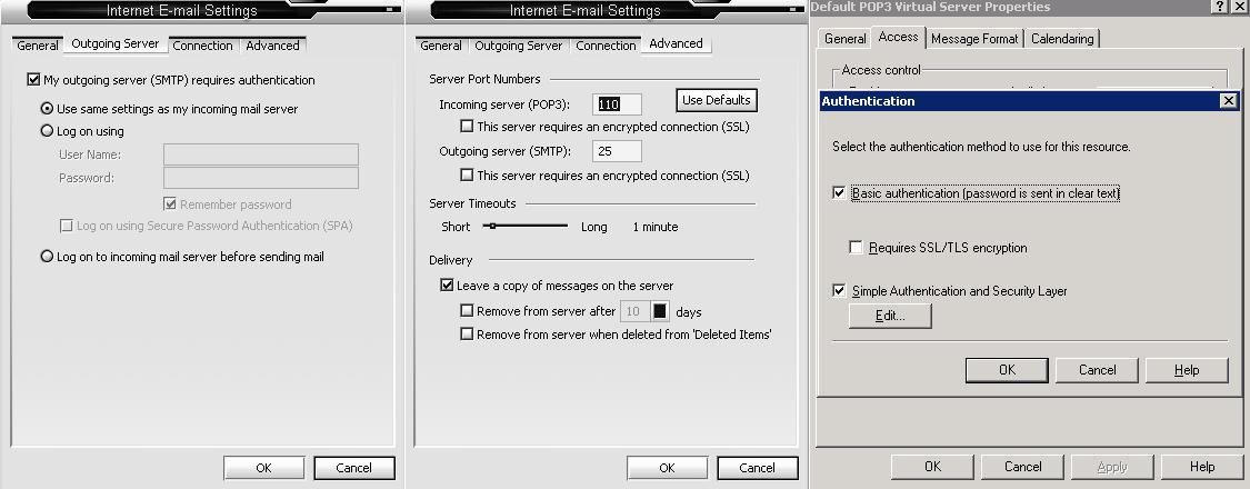 у меня такая проблема мне нужно что бы комп(лаптоп) мог подключится и проверять почту не находясь в лан"е(т.е. вне офиса), я сразу подумал о поп3. вбил в гугл запрос, нашёл туториал, всё понятно, начал настраивать, но в поле где я должен ввести пороль и логин у меня загвоздка. он его не принимает, т.е. как бы и не ругается что не верный но и не пускает, выкидывает форму ввода логина и пороля с ного и сного, я пробовал и логон в домене, и логон(ака алиас) имайла и чужой(соседнего компа) логон всё бестолку, НО логин и пороль administrator он проглатывает без лишних вопросов, и конечно проверяет ящик администраторский а не пользователя я проверял служба поп3 для этого пользователя включина, и пробовал баловаться с ssl и разной авторизацией но всё безтолку кстати, сейчас плюнул на поп3 и решил попробовать с IMAP, и увидел туже картину, не принимает пароль, кроме администратора.... для наглядности прикрепляю скриншот ссл выключен, одним словом вроде как выложил достаточно скринов, что бы более мение обрисовать картину |