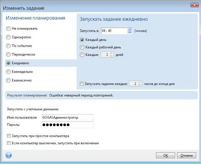 Профиль | Отправить PM | Цитировать При планирование заданий в Acronis-True-Image-Home-2009 запускается задание только один раз. При самаом первом запуске. Дальнейшей автоматическое архивирование архивов не происходит хотя запланировано ежедневно, или с периодичностью в несколько дней (смотря что архивировать). В пункте изменить планирование стоит сообщение: Результат планирования: Ошибка: Неверный период повторений. Что делать непонятно. Руками не всегда есть время каждый раз запускать. Кто знает что с этим делать подскажите!!