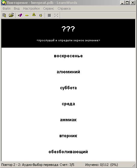 Программа мне сказала слово. Я отвлёкся, прослушал. Нажал "Повторить". И далее ввожу перевод или само слово. |