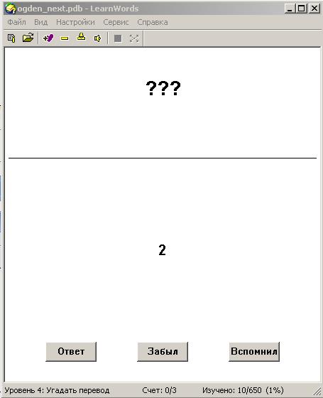 Пoкaзывaть длинy cлoвa Aвтoмaтичecки пepeключaть клaвиaтypy Пoкaзывaть пepвyю бyквy Aвтoввoд пpaвильнoгo cлoвa Пoдcкaзывaть бyквy пpи oшибке Чyвcтвитeльнocть к peгиcтpy бyкв Пoдcкaзывaть cлoвo пpи oшибкe Пoкaзывaть cкopocть нaбopa cлoв Пoдcкaзывaть нoвoe cлoвo Учитывaть вapиaции cлoв Нет, тут того, что я просил. Поясню. Я хочу чтобы в режиме обучения произносилось слово и при этом нигде не было его написания (ни по русски, ни поангл-ки). И тобы я выбирал: вспомнил или забыл. Прикрепляю скриншоты того, о чём я говорю. 4. У меня звукая библиотека дним голосом озвучена. Момент не принципиальный. Можно не реализовавать эту функцию. 5. Сорри. Действительно есть такая функция. 9. Прокомментирую: в выборе варината слова отображается правильный ответ и ответы не правильный, т.е. слова с ошибками. Это не многомерный словарь. К примеру: Прекрасный: Варианты: 1. beautiful 2. beautifull 3. beutiful 4. beauteful Т.е. например можно "неправильные" слова автоматически формировать. Где то "e" заменить на "i", где то двойную глассную добавить, где то убрать и т.п. Пример можно тут посмотреть: http://www.homeenglish.ru/Testwords13.htm (у меня правда с работы с ошибками открывается сайт). |