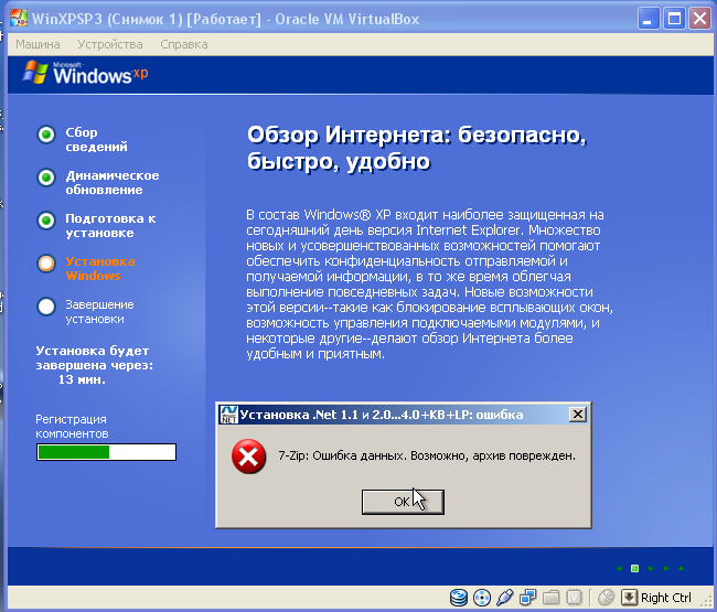 Профиль | Отправить PM | Цитировать Скачал аддон, разархивировал, интегрировал в чистый дистрибутив. Проверяю новый дистрибутив на виртуальной машине (озу 700 Мб) в моменте когда остается 13 минут, выскакивает ошибка: 7-zip ошибка данных. Возможно архив поврежден. Естетственно аддон не установился.