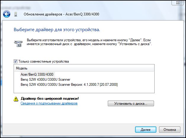 Профиль | Отправить PM | Цитировать Решение есть! Нужно для начала скачать и установить программу VueScan, потом настроить драйвер в висте...лично у меня вот как получилось...в диспетчере устройств нажимаю на сканер -> обновить драйвер -> выполнить поиск на своем компе -> выбрать из списка уже установленных драйверов, вот там я выбрал ACER/BENQ 3300/4300 и нажимаю далее. Дальше драйвер обновляеться и при запуске VueScan можно сканировать...Ура!