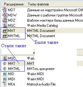 Каким-то образом у меня изменились стандартные значки "MHT". Не знаю, когда это произошло, но есть подозрения, что после установки Internet Explorer 8. Как вернуть назад стандартные значки? А то эти жутко уродливые. OC Windows XP Professional SP3. Заранее спасибо. |