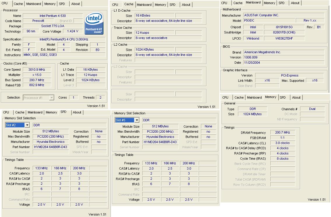 Мат. плата Asus P5GDC Началось все полгода назад, комп стал часто подвисать, долго "думать" при открытии папок, копировании файлов. Переустанавливал ОС - не помогло. Программой CPU-Z протестировал компьютер, выложил все на 1 скриншот. |