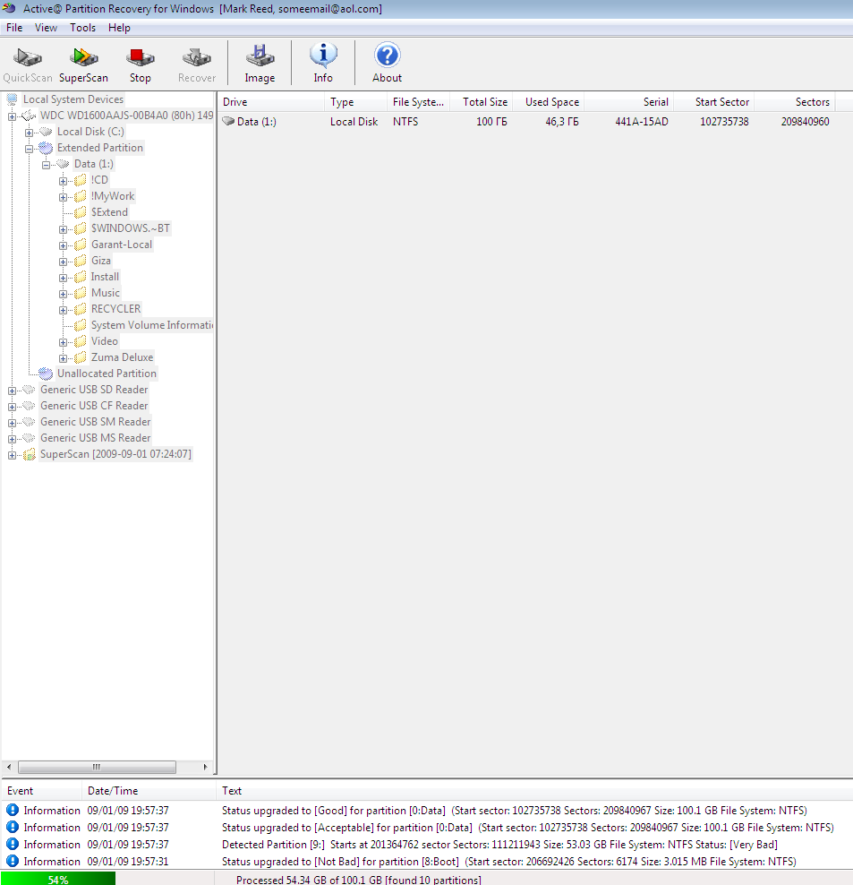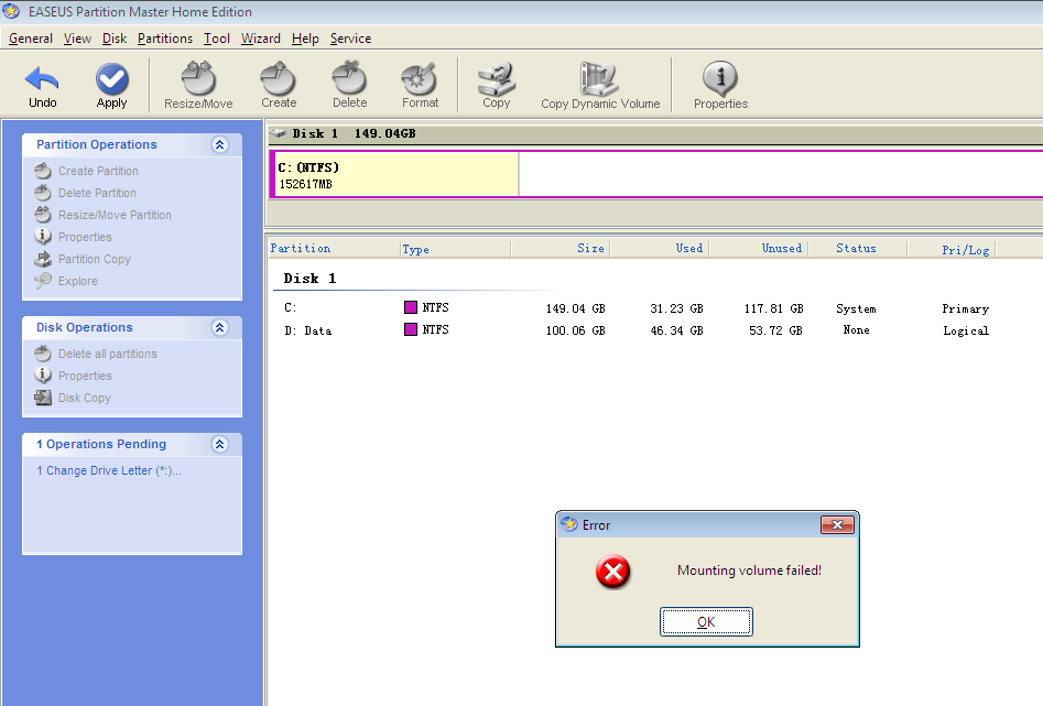 Профиль | Отправить PM | Цитировать Программу скачал, потерянный раздел она видит, показывает папки и файлы на нём, однако при назначении любой буквы рузделу программа вначале пытается её присвоить, то есть появляется окно на 2 секунды на нём три бегущие строки, все достигают на 100%, после чего окно исчезает и вылазиет ошибка "Mounting volume failed". При проверке раздела "Check Partition" ошибок найдено не было, Bad sectors также не обнаружено.