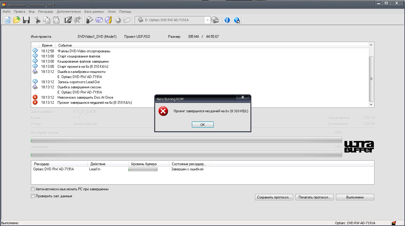Проблема в записи. В начале записи он разгоняется - потом опять сбрасывается, и так несколько раз (видимо пытается но у него (привода) ничего не получается). Потом в логе неро выдает:
