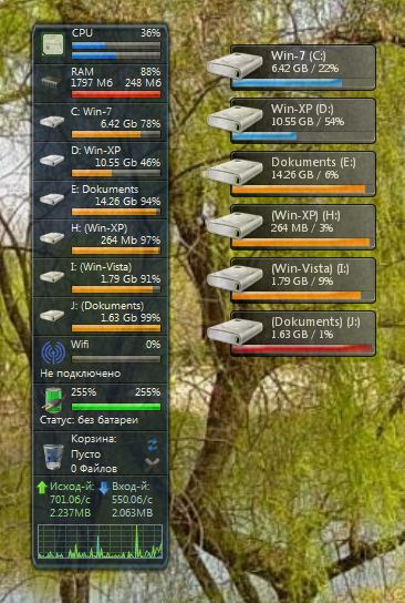 ![]() Тот что справа, хорош, но постоянно ест ресурсы процессора! У того что слева вроде бы этой проблемы нет, но у него очень мелкие индикаторы занятости дисков, и они одноцветные, не меняются в зависимости от степени заполненности дисков ![]() Кто бы сделал гаджет показывающий занятое место на дисках, лишённый этих двух недостатков? |