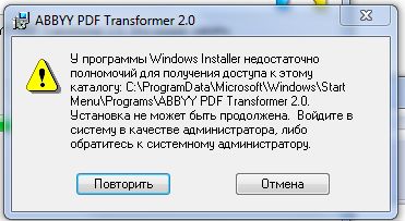 Прикрепил скрин... Тоже самое с ABBYY PDF Transformer. На этапе создания ярлыков "установка не может быть продолжена". |