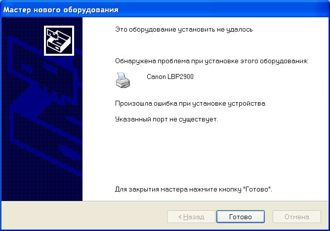 Профиль | Отправить PM | Цитировать Сегодня попробовал и этот способ. Почему-то результат одинаковый... Единственное на что обратил внимание - после включения принтера (это делается после установки драйверов) в облачке "найдено новое оборудование" сначала появляется "CanonLBP2900", а потом "Canon LBP2900". Ну и снова "Указанный порт не существет"