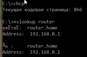 866 она выдает (см. приложение). А проблема в кривой локализации именно программы nslookup.exe. Лечится удалением/переименованием файла %SystemRoot%\System32\ru-RU\nslookup.exe.mui (весь вывод станет на английском) |