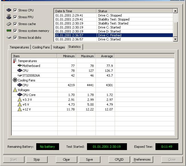 Профиль | Отправить PM | Цитировать Nayan, полную конфигурацию вашего компьютера - в студию! Все компоненты - производитель, модель; блок питания - производитель, модель, мощность, возраст? Установите программу Everest: какие она показывает температуры на компонентах? А напряжения? Запустите Тест стабильности системы, показания напряжений и температур должны быть по всем датчикам. Через 5-7 минут выложите скрин вкладки Statistics.