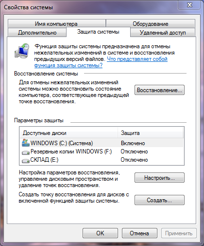 А как обстоят дела с восстановлением системы на диске Е, оно включено? |