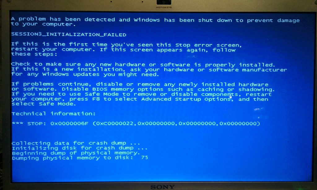 Вот такая ошибка Session3_Initialization_Failed STOP 0x0000006F (0xc0000022,0x0000000,0x00000000,0x00000000).