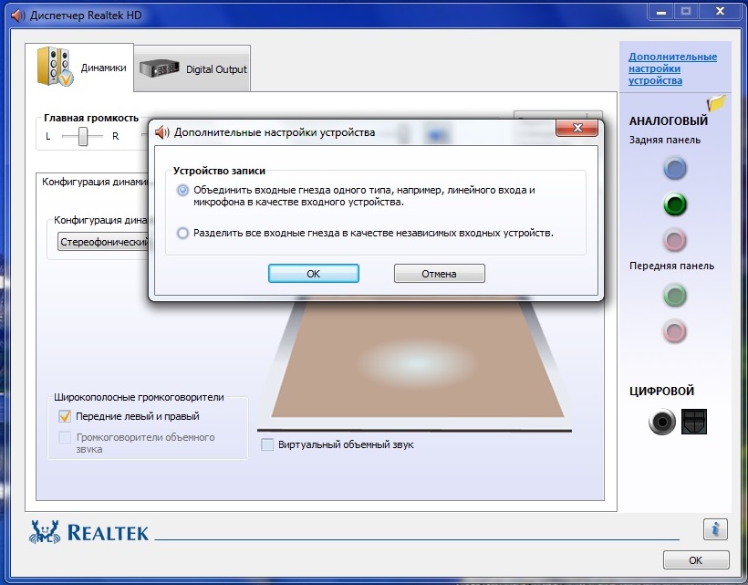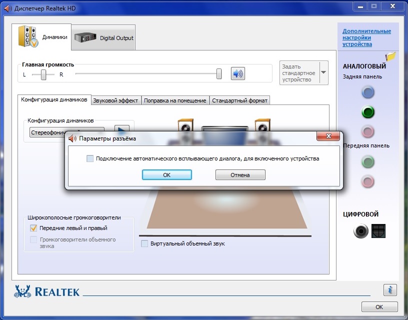 И если выключена передняя панель в настройках - смело включайте и будет счастье. У самого не Realtek сейчас на компе, поэтому изображения не смогу прикрепить, чтобы нагляднее показать настройки. |