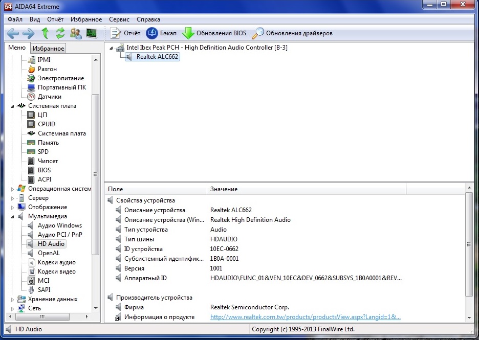 Сначала была ХРюшка, никаких проблем с аудио драйверами. Потом перешёл на 7-ку х32, перестала передняя панель видеть микрофон. После долгих мучительных скачиваний и установок драйверов разных версий с офф-сайта реалтек проблема чудом решилась. В связи с расширением оперативной памяти поставил 7-ку х64, предыдущий вариант "насилования" драверами разных версий уже не помогает. Суть проблемы такова: в программе реалтека отсутствует пункт "отключить определение гнезд передней панели", а так же пару пунктов в "дополнительных настройках устройства" (скрин 1.). Вобщем всё работало нормально на хрюшке и "чудом" на 7-ке х32, а вот щас на х64 никак. Все галочки как у вас в шапке - есть, в биосе разве что High Definition Front Panel Audio можно поставить Disabled и отключить полностью звук. Скринты об устройствах прилагаю. Ид оборудования: HDAUDIO\FUNC_01&VEN_10EC&DEV_0662&SUBSYS_1B0A0001&REV_1001 HDAUDIO\FUNC_01&VEN_10EC&DEV_0662&SUBSYS_1B0A0001 |