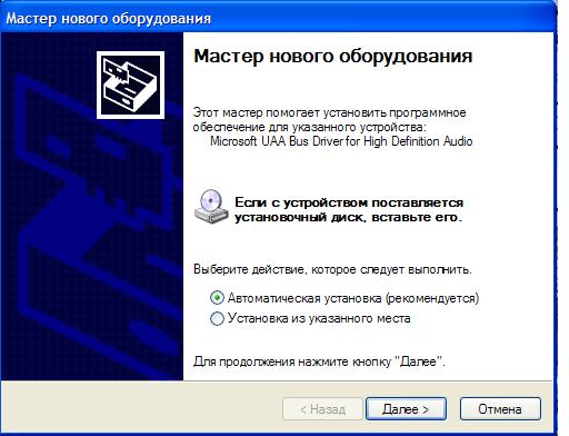 При загрузке ОС постоянно появляется мастер установки оборудования! Требует установить драйвер: Microsoft UAA Bus driver Defintion Audio. Как с этим бороться?