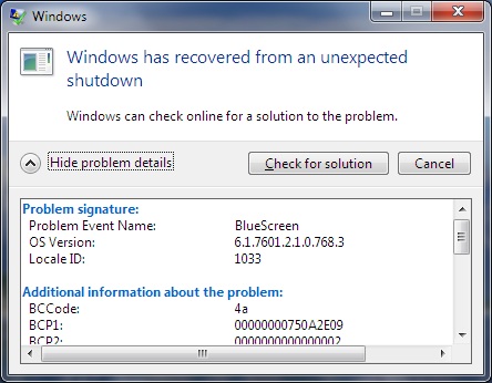 Crash date: Sat Jul 24 22:29:59.941 2010 (GMT+4) Stop error code: 0x4A Process name: ekrn.exe Probably caused by: ntkrnlmp.exe ( nt!KiSystemServiceExit+245 ) Можете выложить еще несколько дампов (для сравнения). |