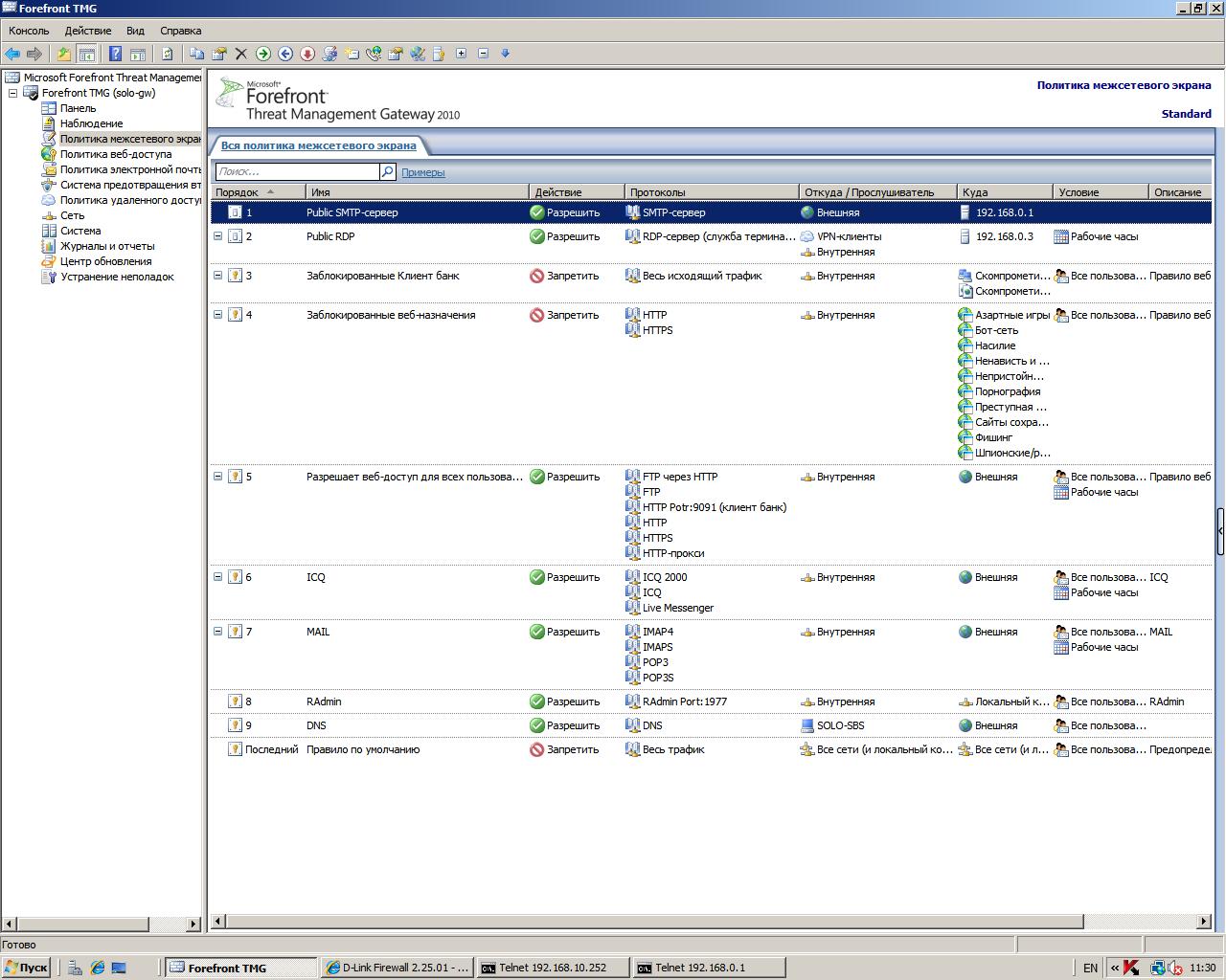 схема на данный момент следующая нтернет d-link (dfl-800) (интернет,192.168.10.1) сервер1: (isa 2004, MDaemon) (192.168.10.254;192.168.0.254) сервер2: (TMG) (192.168.10.252;192.168.0.252) сервер3: (AD, DNS, SQL, Exchange 2003)(192.168.0.1 шлюз 192.168.0.252) соответственно все манипуляции делаются из сети 192.168.10.0 в интернету как и положено отвечает ранее настроеный и рабочий почтовик. |