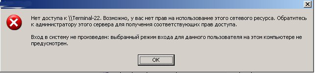 "Нет доступа к ip \\xxx.xxx.xxx.xxx Возможно у вас нет прав на использование этого сетевого ресурса. Обратитесь к админу. Вход в систему не произведен выбраный режим входа для данного пользователя на этом компе не предусмотрен"