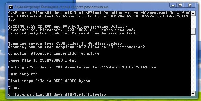 oscdimg -u1 -udfver102 -m -bD:\Seven\DVD\boot\etfsboot.com D:\Seven\DVD D:\Seven\Win7wIE9u102.iso P.S. Ещё "для оригинальности" можно добавить метку -lметка (см. Параметры командной строки Oscdimg) |