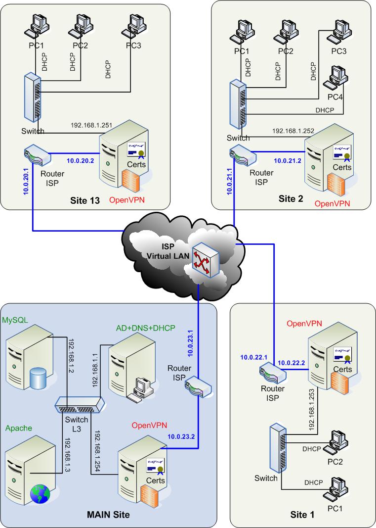 Нужна помощь. Пожалуйста, не направляйте на другие топики или ссылки если он напрямую не касаются моей проблемы. Как только смогу успешно завести сеть, обещаю в течение 2 недель напишу подробную статейку и скину сюда на форум. Я прочитал 2 книги по OpenVPN (Beginning to OpenVPN and OpenVPN Cookbook) но все же есть вопросы. У нас имеются 14 филиалов. Взяли у провайдера сеть типа 10.0.23.0/30 для каждого филиала. Первый адрес для шлюза, а второй для OpenVPN сервера. В каждом филиале по 2-4 станции и OpenVPN сервер. Скорость канала в главном офисе 1024 кб/сек, а в филиалах 256. В главном офисе имеются сервера Database, Web, Active Directory, DNS, DHCP, NTP и др. Рисунок 1. Общая структура сети. Необходимо объединить филиалы в одну сеть, но чтобы филиалы друг-друга не видели, а только головной офис. Также шеф не хочет чтобы на каждой станции хранились ключи и сертификаты. Поэтому решил организовать Site to Site OpenVPN сеть, где о сети VPN знают только сервера OpenVPN, а для всех других шлюзом являются OpenVPN сервера. Все клиентские станции должны аутентифицироваться в Active Directory (windows 2003) domain. Только после этого им разрешается доступ к Web server. Знаю, что имеются 2 режима: Ethernet bridging и routing. Вопросы: 1. Стоит ли использовать Ethernet bridging. Если да, то вся сеть будет как локальной? Если да, то как мне отсечь филиалы друг от друга? 2. Если использовать routing, то, как мне передавать удаленным станциям IP адрес от DHCP server в головном офисе? 3. Если это невозможно, то могу ли я через DHCP relay передавать запросы? 4. Какие подводные камни имеются при использовании Active Directory через OpenVPN? Спасибо заранее. |