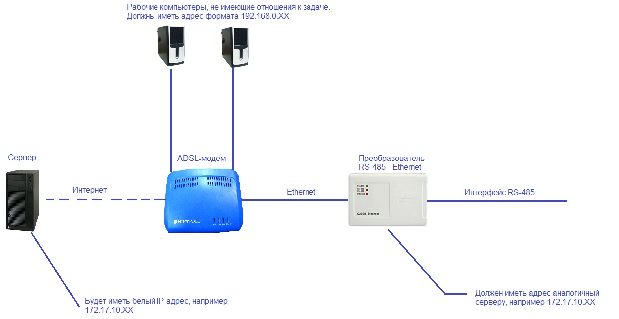 Возникла задача подключить к серверу технологический контроллер, имеющий интерфейс Ethernet. Сервер, как ему и полагается, расположен в серверной, а вот технологический контроллер где-то у черта на куличках. На удаленном объекте (где стоит контроллер) есть интернет через ADSL-модем "Интеркросс" (модель не помню, при необходимости уточню). Присвоить серверу белый IP проблем не вызовет, а вот с технологическим контроллером беда - он знать не знает ни о каких VPN-ах, VLAN-ах и прочих плюшках. Все сетевые настройки контроллера показаны на рис. 2 (C2000-Ethernet.jpg). Как мне загнать сервер и сетевой контроллер в один диапазон адресов? Структура сети показана на рис. 1 (Сетка.jpg). Заранее благодарю за консультацию. |