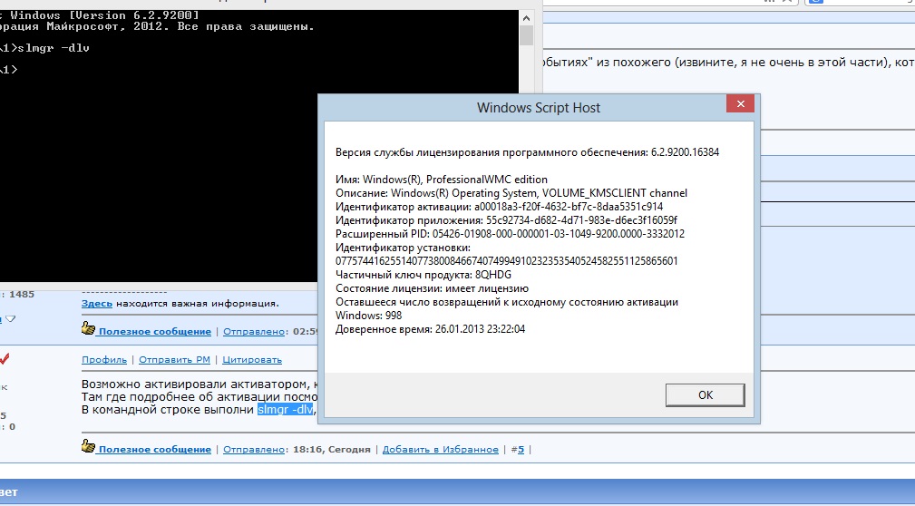 Профиль | Отправить PM | Цитировать После установки window 8 (устанавливал не я, знакомый знакомого) и, вроде бы, активации все равно при запуске компьютера и каждые 2-3 часа появляется сообщение с просьбой активировать windows. Хотя в свойствах системы пишет, что система активирована. Собственно вопрос - как избавиться от этого напоминания, выскакивающего, как всегда, не вовремя? У человека, ставившего ось, уточнить что-либо на данный момент нет возможности.