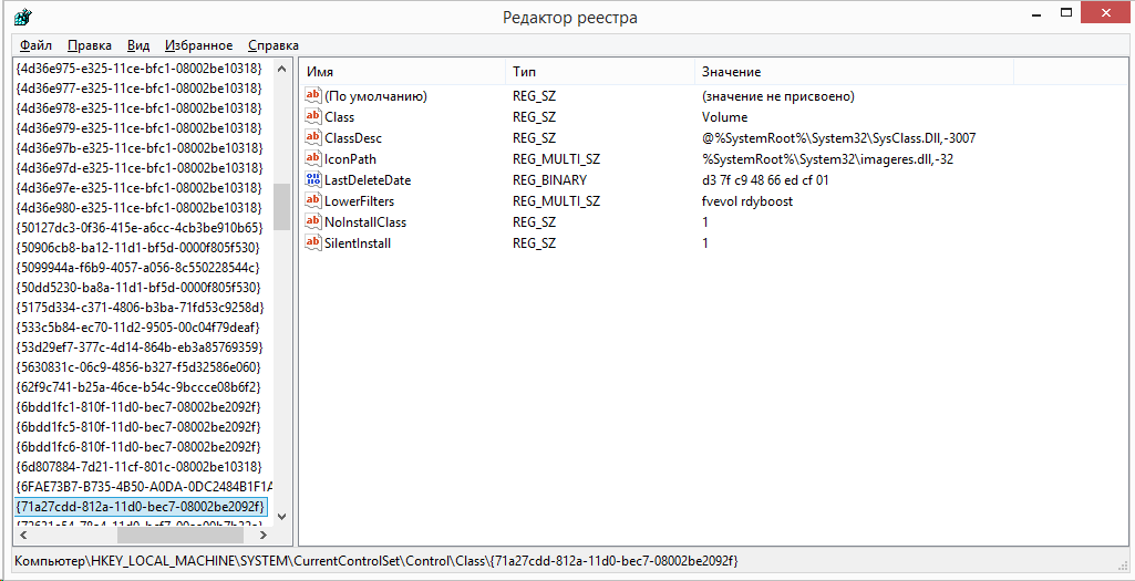 Опишу что происходит: Вставляю флешку,слышу звук подключени "ту ду ду"...но реакции нет вообще никакой. В моем компьютере так же ничего не появляется. Реакцию можно заметить только в Диспетчере устройств. В разделе "Дисковые устройства" появляется silicon -power USB Device. На значке виднеется восклицательный знак Если проверить состояние,то видно: Не удалось загрузить драйвер этого устройства. Возможно, драйвер поврежден или отсутствует. (Код 39) {Загрузка драйвера устройства невозможна} Не удалось загрузить драйвер устройства %hs. Код ошибки 0x%x Мои действия: -Пробывал вставлять 3 флешки разных размеров и от разных производителей в разные USB (от всех один и тот же результат,неудачный) -Мышь себя чувствует в любой USB отлично. iPhone подключается и распознается тоже без проблем. Так же пробовал подключать внешний сидюк,работает. -Искал параметры LowerFilters и UpperFilters в разделе реестра HKEY_LOCAL_MACHINE\SYSTEM\CurrentControlSet\Control\Class\{36FC9E60-C465-11CF-8056-444553540000} (не нашел) -Удалял в Диспетчере устройств все Контроллеры USB (драйвера поставились автоматически снова,результат тот же) -Пробывал программу MK Quick Fix (она заглючила и зависла со словами "Working..."странная программа,не советую) Вроде все...мож че забыл -букву флешки поменять не могу,т.к не её не видно Ах да...винда стоит 8.Использую ноутбук acer aspire V3-571G (если это имеет значение) |