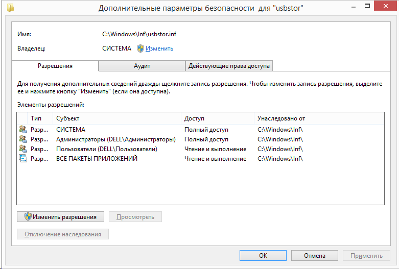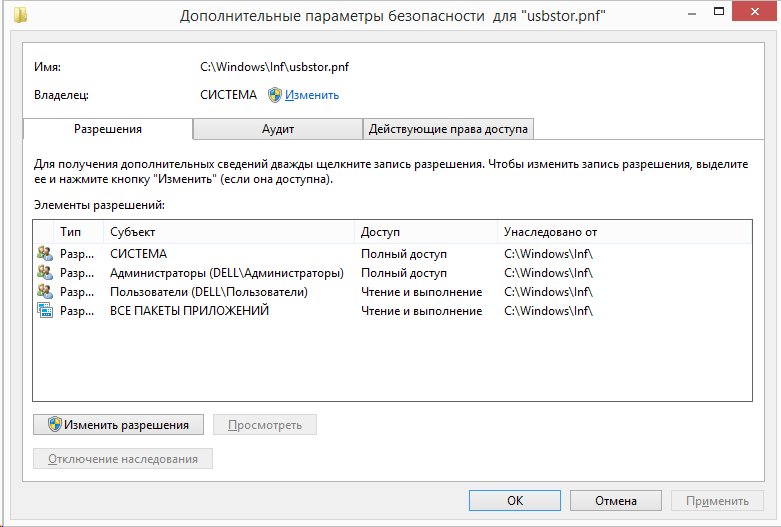 Просмотрите в перенесенных Вами файлах usbstor.pnf и usbstor.inf, в свойствах - Безопасность. Система, Администраторы должны иметь полный доступ. Пользователи- Чтение и выполнение. Владелец файлов - Система. В помощь https://www.outsidethebox.ms/10539/ Нажмите Win+R > введите %TEMP% > OK Удалите все файлы в открывшейся папке(некоторые файлы не удалятся) После проверьте наличие проблемы. |