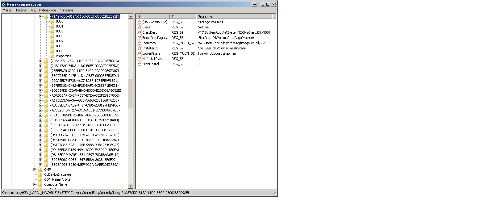 Профиль | Отправить PM | Цитировать ruslan..., менял в {4D36E967-E325-11CE-BFC1-08002BE10318} значение UpperFilters на "только PartMgr" - система перестает грузиться, спасает только "загрузка последней удачной конфигурации", которая ставит эти значения на место, сейчас попробую с LowerFilters в 71A27CCD... , Акронис уже удалил, также как и КриптоПро