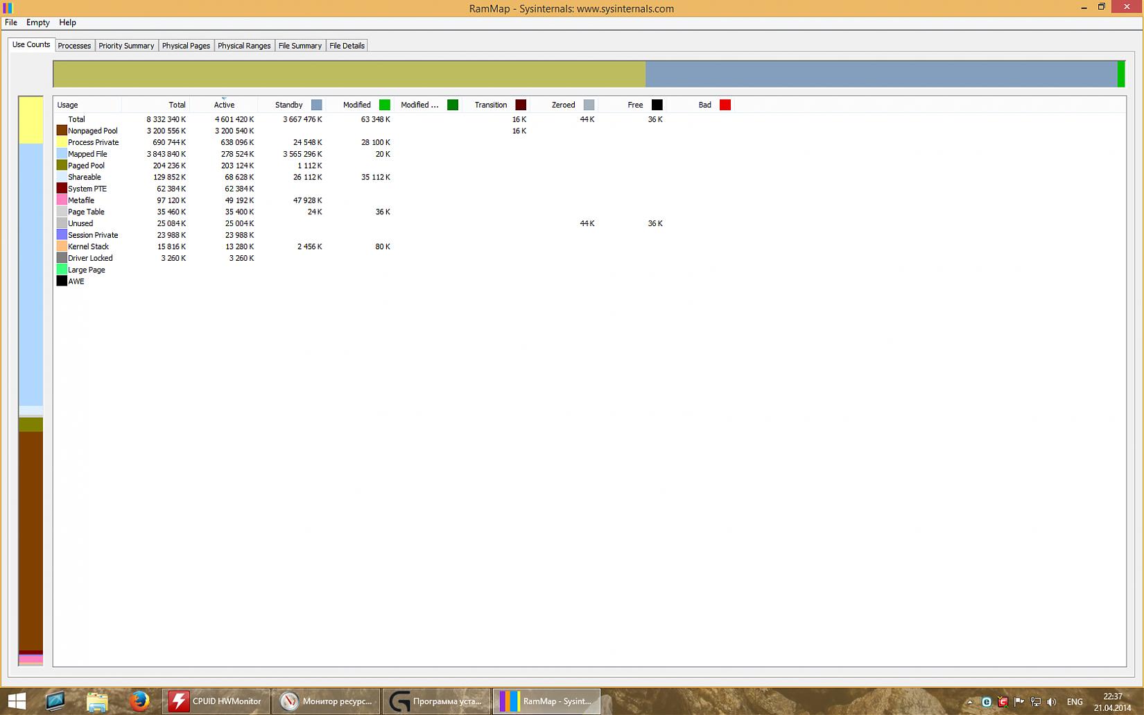 Microsoft Windows 8.1 Professional х64 Intel Core i5-3570, 3.40GHz Corsair 2x4Гб GeForce GT 640 (2 ГБ) иногда комп перемыкает и с 1.7-1.8гб загрузки оперативки за пару минут сжирает всю либо до зависания, либо до окна о необходимости закрытия программ для освобождения памяти. Сначала грешил на браузер, пробовал менять их, не помогло (позже заметил, что бывает такое и если браузер не открыт). Включил файл подкачки, результата нет. Переустановил винду (правда сборка та же), не помогло. Скрин сделал когда начался активный отжор памяти, мб рановато, но боялся зависания. |