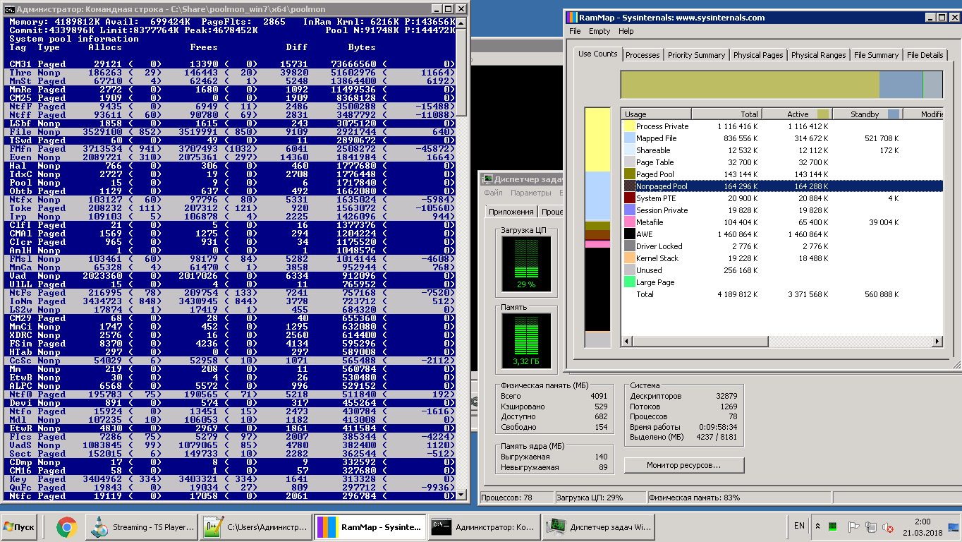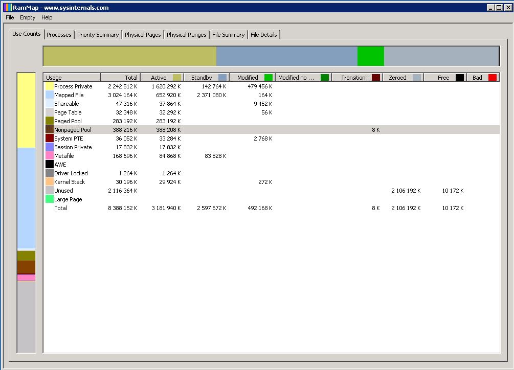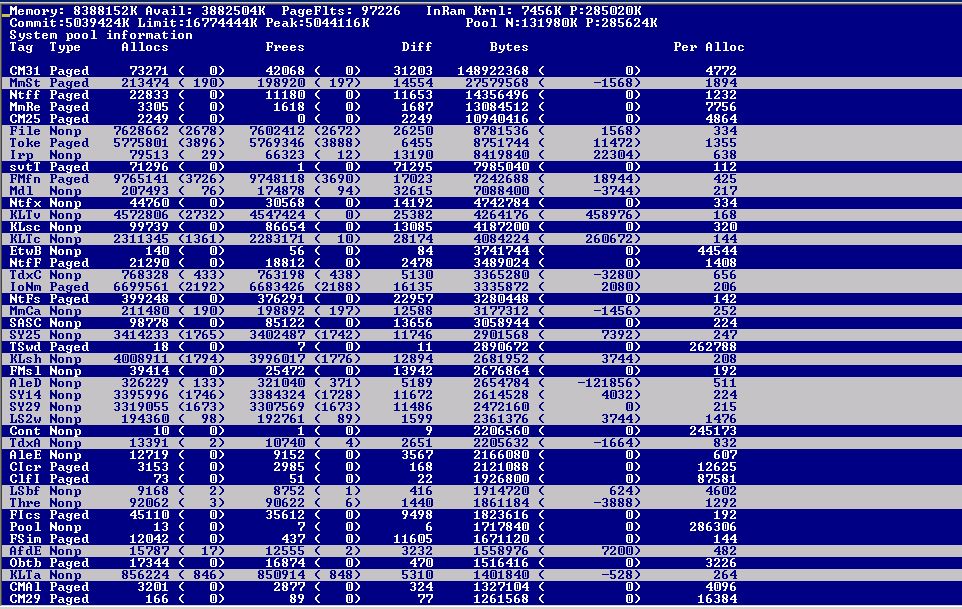 1. При появлении проблемы запустите RAMMap и сделайте скриншот вкладки Use Counts. 2. Если вы видите высокoe значениe NonPaged Pool: