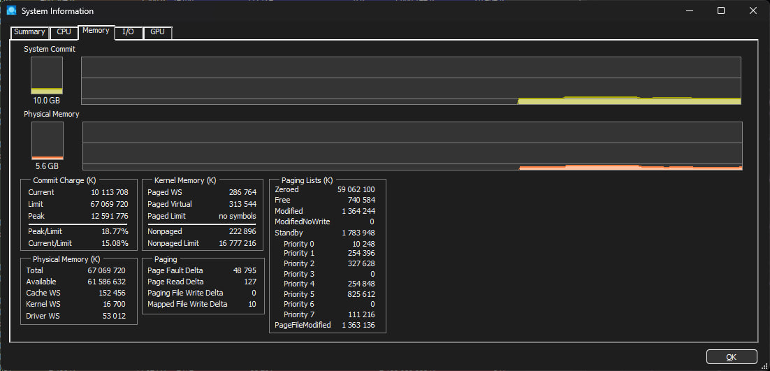 10.0 != 5.6 Сейчас 22 часа аптайма, System Commit он же Виртуальная память, занимает 41 гигабайт при том, что RAM показывает занято только 13 В фоне висит игра на паузе, поэтому занято много, закрывать игру не хочу - у меня же памяти много ... Но вчера вечером после перезапуска - вместе с игрой System Commit показывал 35 гигабайт, то есть 5+ гигов уже куда-то утекло само по себе Учитывая что файл подкачки отключён - текущий показатель RAM во всех смыслах есть ложь Смотреть надо на System Commit, туда происходит реальная утечка, но я не знаю, как эту утечку отслеживать Если допустить полное заполнение System Commit - для системы это будет критикал, без преувеличений Никакие процессы не выглядят подозрительными, а поочерёдным исключением того или иного софта - я занимаюсь на протяжении 10 лет Единственное что я не могу исключить принципиально - системный менеджер памяти, может быть какие-то свои привычки, которые неочевидным образом вызывают подобную утечку Цитата Cereal Keeler: